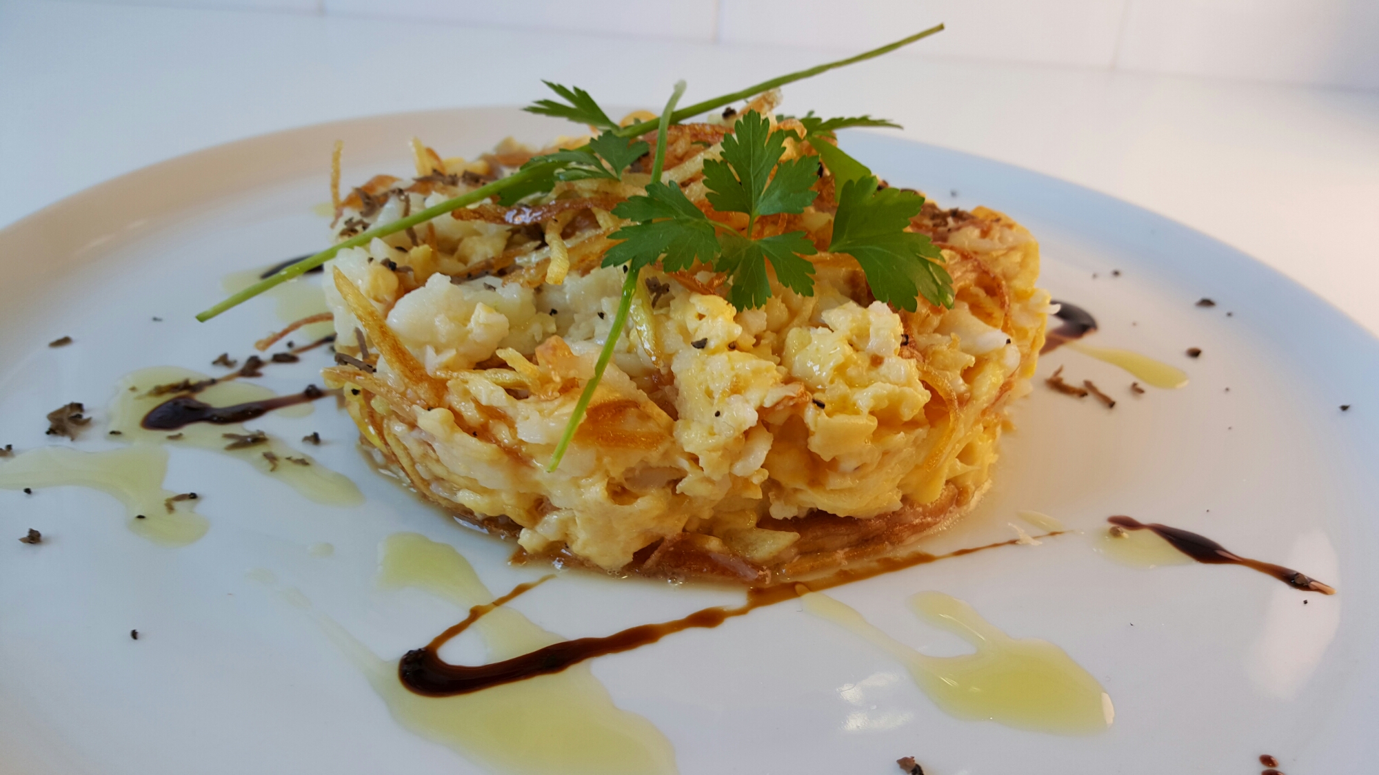 Es una tapa perfecta para acompañar un vino blanco, una cerveza o un vermut. Tiene tres ingredientes principales: Huevo, patatas y bacalao.