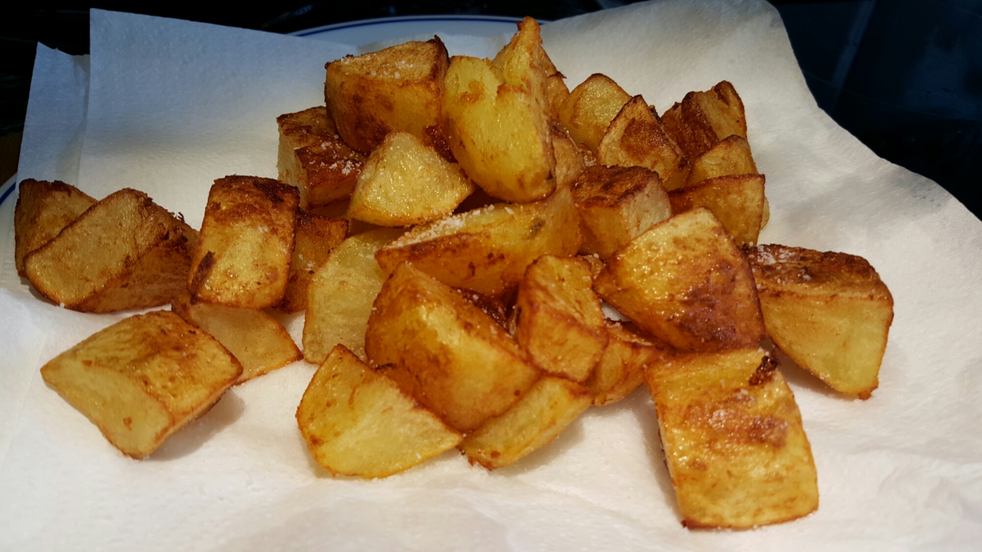 Después de pelarlas y cortarlas las cueces en abundante agua hasta que estén casi blandas, las sacas, las escurres y cortas la cocción sumergiéndolas en agua fría, las vuelves a escurrir y las fríes en aceite de girasol a fuego medio/fuerte.