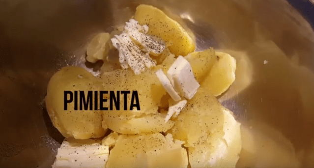 - Pelar patatas y añadir sal mantequilla y pimienta al gusto. Machacar todo.