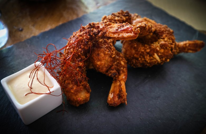 De Especial Mención: Gambones con gabardina de cacahuete y salsa de chile chipotle. Esos hilos son de chiles. Este plato lo elijo porque amo el chile chipotle, si quieres ver alguna receta con chiles prueba la de los tacos al pastor en la sección de recetas.