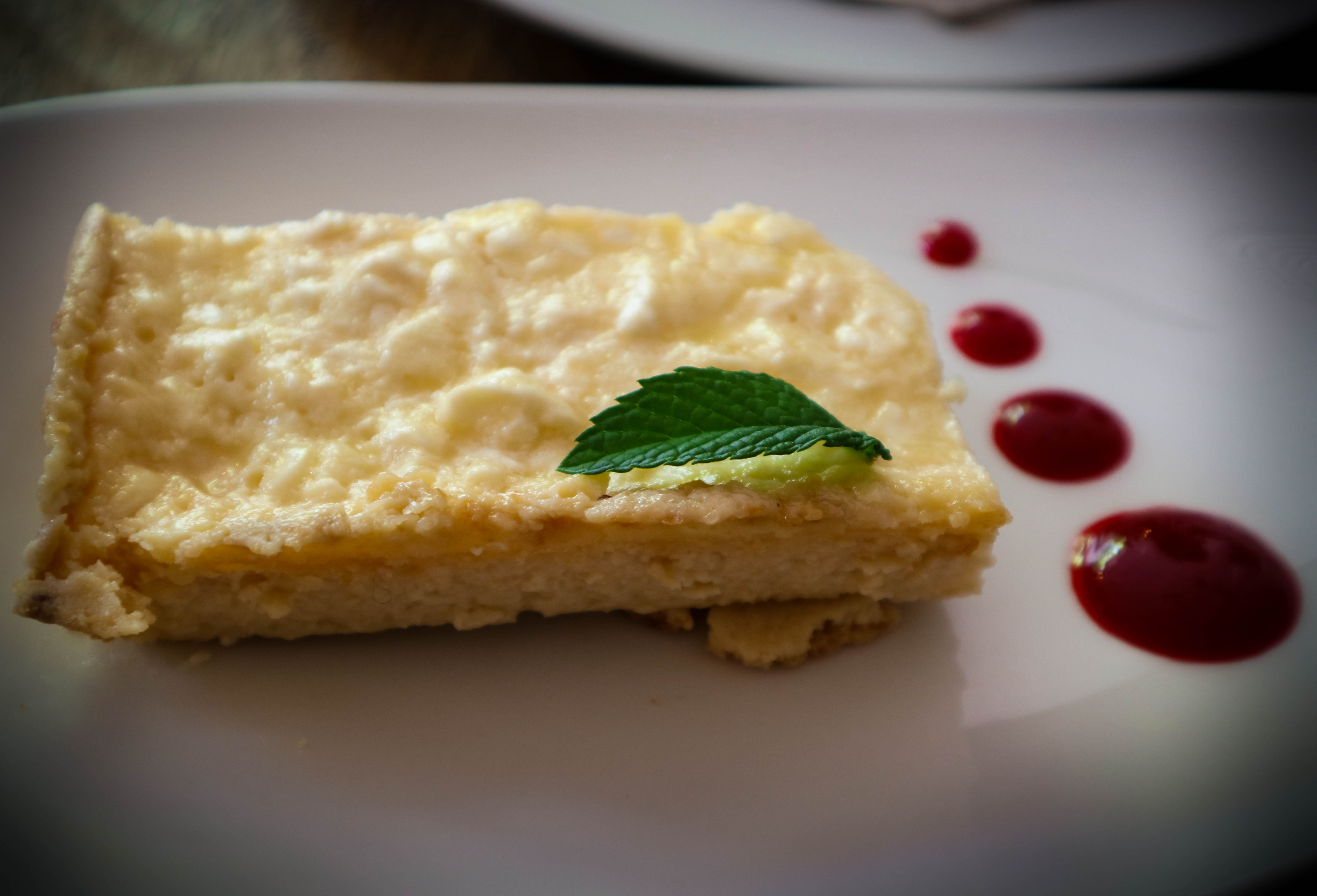 Aperitivo para cada mesa: pastel de chorizo con mousse de cerezas. Atención a los emplatados: menos es más siempre y en la carta ni te cuento, pero de la carta hablamos al final.