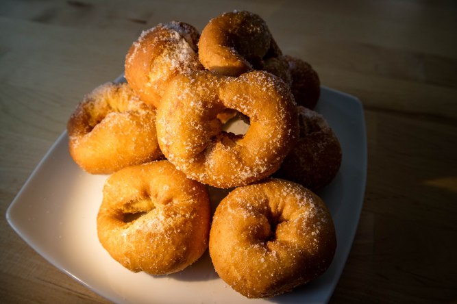 Calienta una sartén o cazo con aceite de oliva y fríe las rosquillas hasta que se doren, dándoles la vuelta con unas pinzas. Sácalas a un plato con papel secante o bañalas en azúcar, azúcar glass o lo que más te guste.