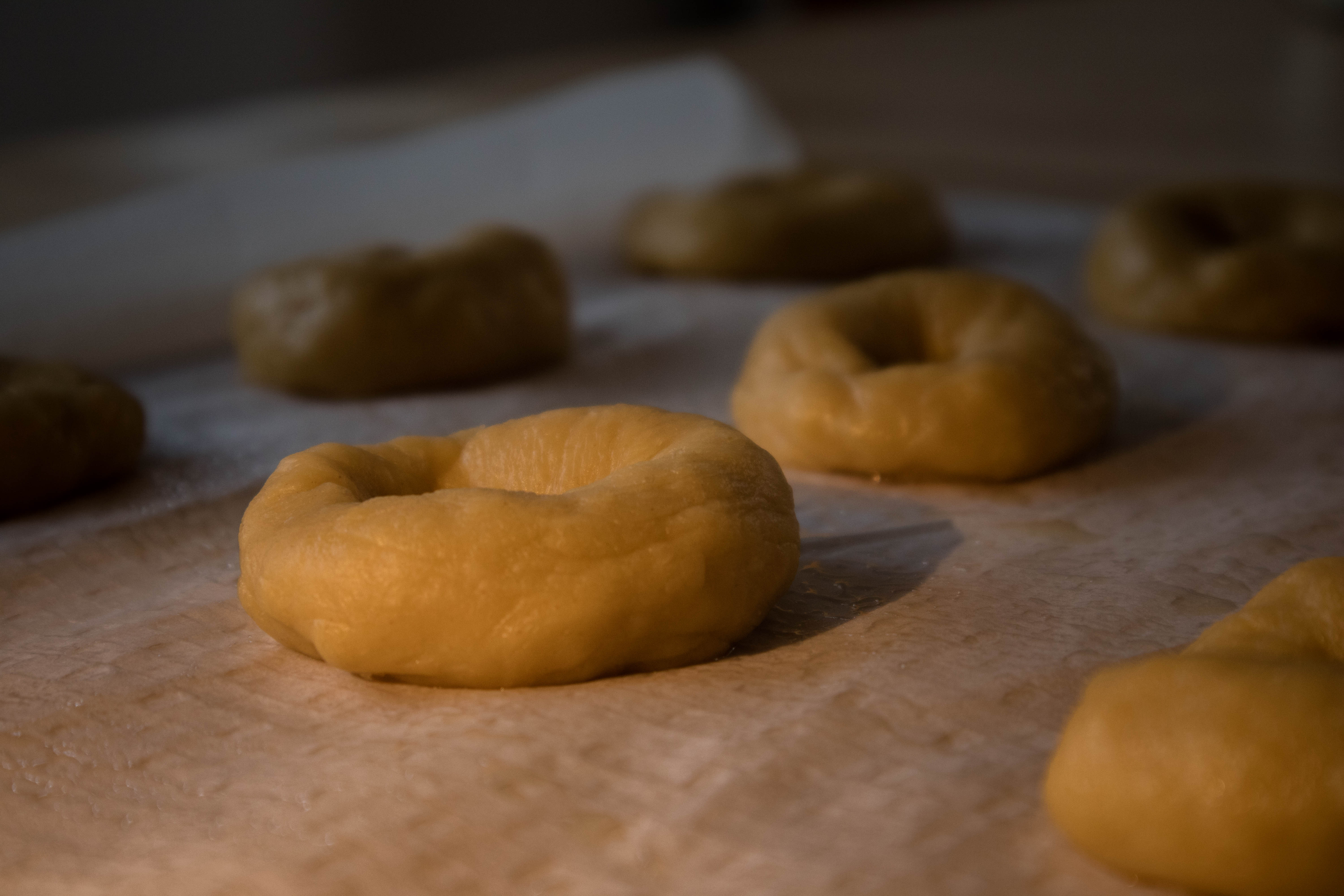 Para acabar tamiza 250 gr de harina floja (la que no es «de fuerza») o harina de repostería, junto a un sobre de levadura química y mezcla hasta que no te quede otra que amasar sobre una mesa añadiendo harina para que la masa no se pegue, y una vez consigas que no se pegue haz porciones (con estas cantidades pueden salirte entre 12 y 16 porciones). Estíralas como si fueran un rulo de plastilina sobre la mesa y cierralas con un pellizco (apretando las puntas).