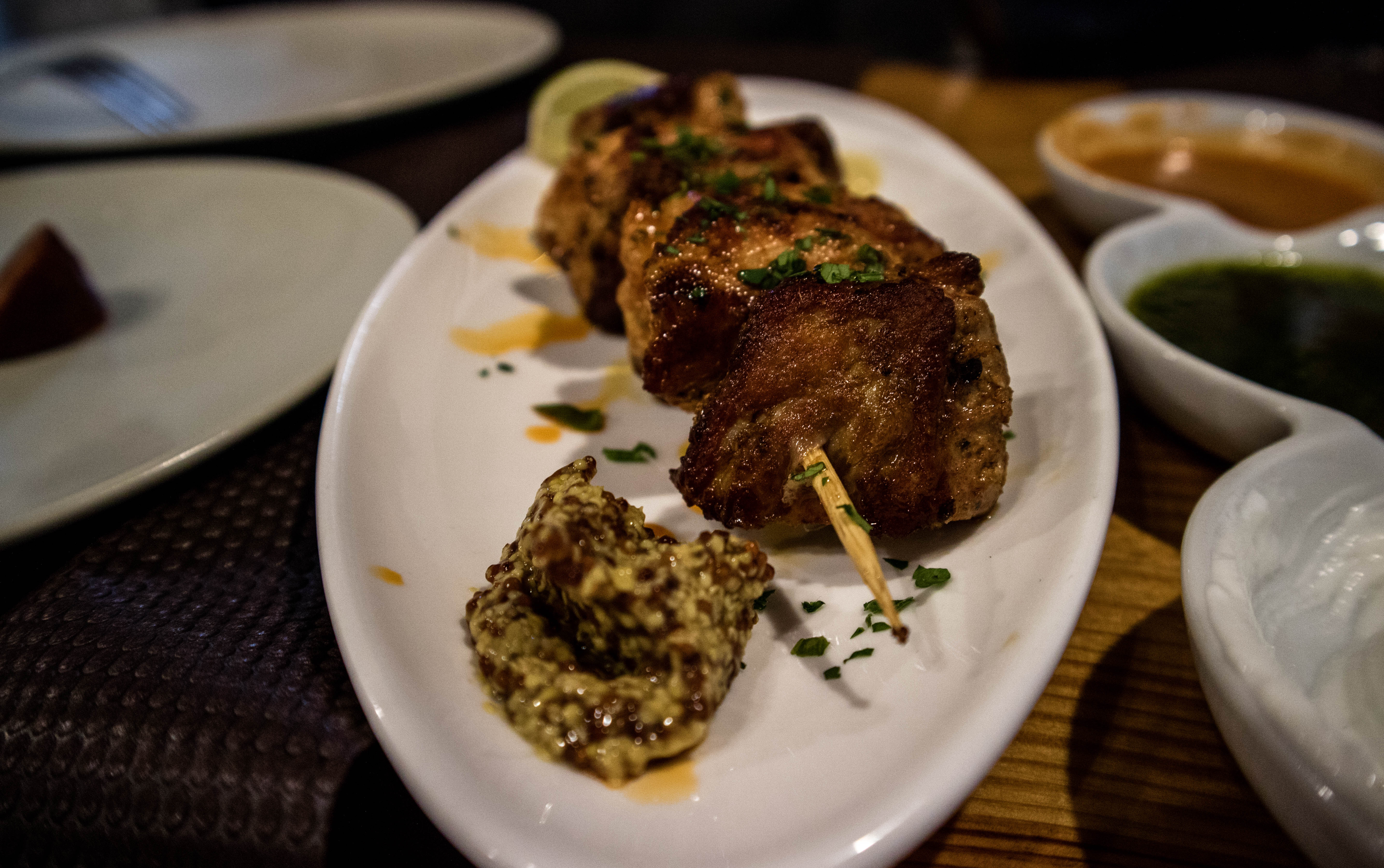 Pincho moruno con dos mostazas: trozos de carne grandes, tiernos, bien especiados y acompañados de mostaza de Dijon.