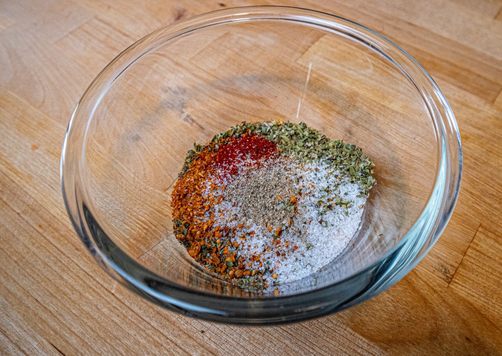 Mezcla en un bol las especias y añade el agua caliente para hidratarlas y que suelten sus aromas, en un bote echa el aceite, el vinagre, la mezcla de especias, el perejil y los ajos picados y remueve. Listo !! Puedes guardar esta mezcla hasta dos semanas.