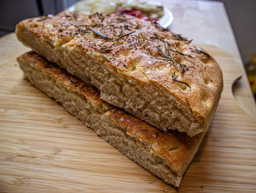 La focaccia (/fo.ˈkat.tʃa/ «focacha») es un pan plano que puede estar cubierto con hierbas aromáticas, especias, sal gruesa o escamada y aceite.