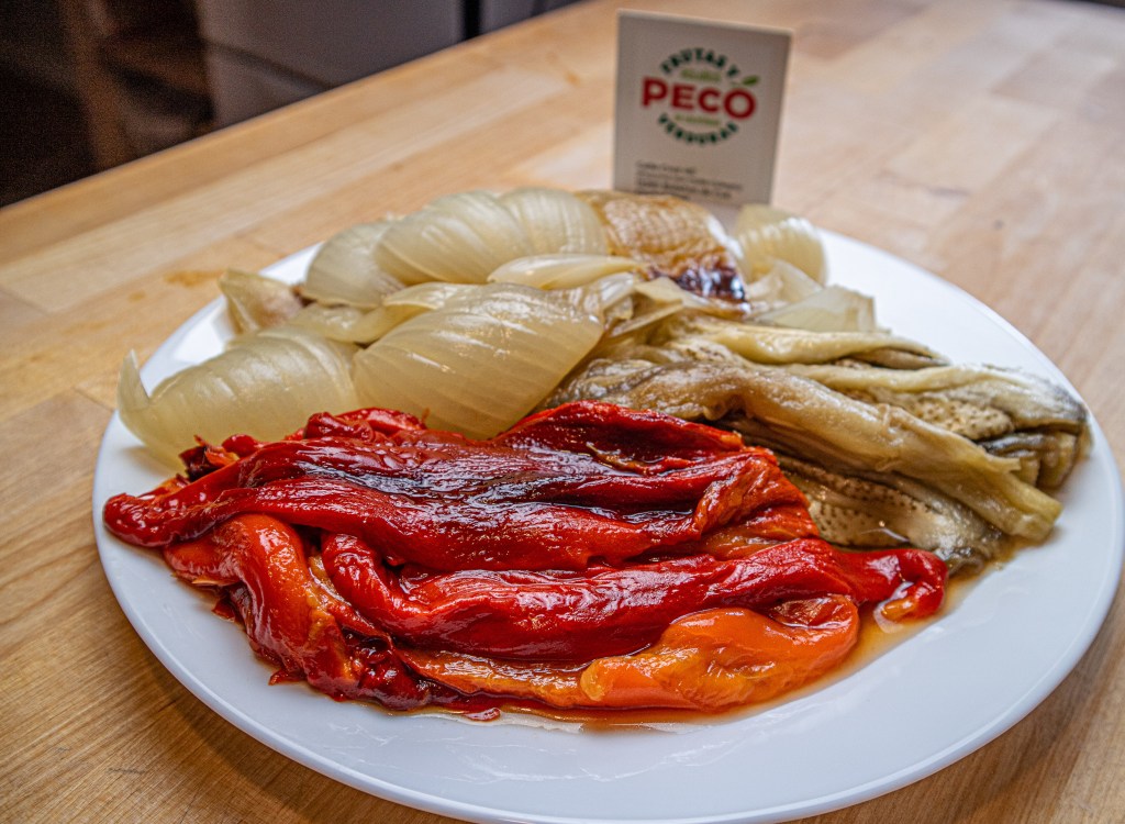 Pon en una bandeja de horno los pimientos las berenjenas y las cebollas , añádeles AOVE por encima y mete al horno a 250º hasta que se tuesten.